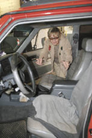 Karen Hooper of Renton demonstrates how she reached into her Jeep Cherokee to grab the backpack of a young man who was trying to steal her vehicle Sunday morning. The would-be thief ran off but was caught soon after.