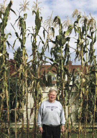 Most corn stalks reach seven or eight feet tall. In Wyman Dobson’s Renton garden, the metal rods that hold up his corn are eight feet. At 14 feet, his corn stalks are nearly twice that height. Each cob splits into three big pieces for corn on the cob.