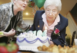 The cake is for Dora Champoux. She turned 104 Tuesday, and her caretaker Nadia Craia threw a party.
