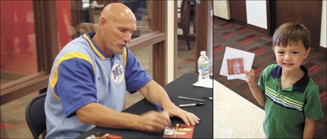 At right, Cody Maas, a 5-year-old from Renton, shows a picture of himself with Buhner.