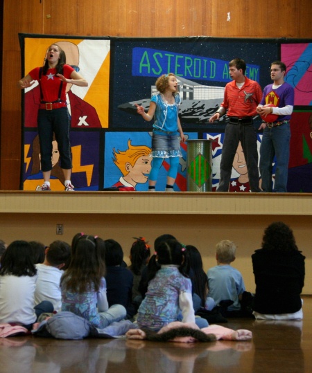 During a performance for elementary students, brightly-colored superheroes learn how to respond to bullies through trial and error. One student superhero uses a time-controlling teacher to see what method works best.