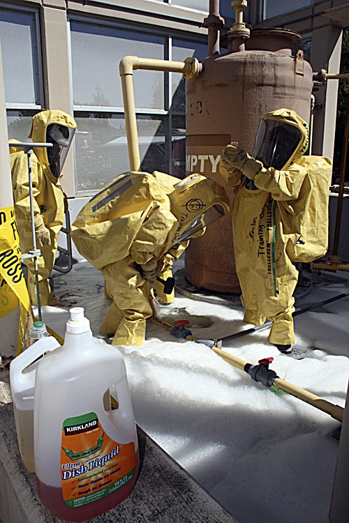 Armed with heavy gear, stuffed toys and high-tech equipment, firefighters drilled together in Renton Friday in simulations of hazardous-materials spills.