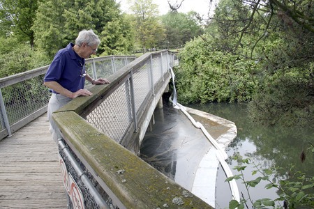 Booms have been placed in Johns Creek in Gene Coulon Memorial Beach Park on Lake Washington to catch any cooking oil that leaked from a container damaged by a garbage truck last Friday at The Landing.