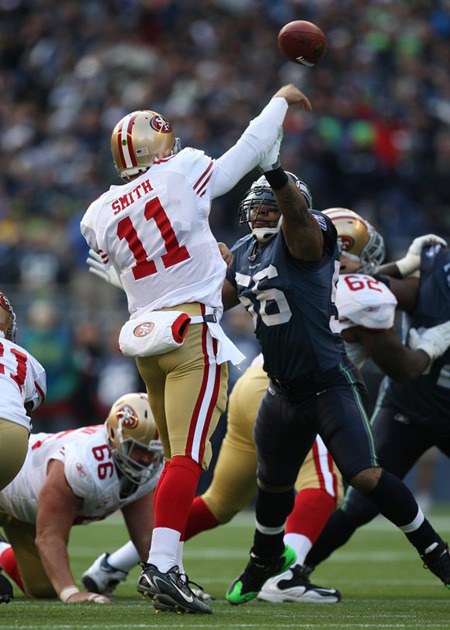 Seahawks linebacker Leroy Hill rushing San Francisco quarterback Alex Smith in a game last season.