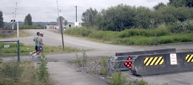 The stubby Strander is blocked by jersey barriers; beyond those barriers is the Interurban Trail, the Burlington Northern tracks and finally Renton, where Strander becomes 27th Avenue Southwest.