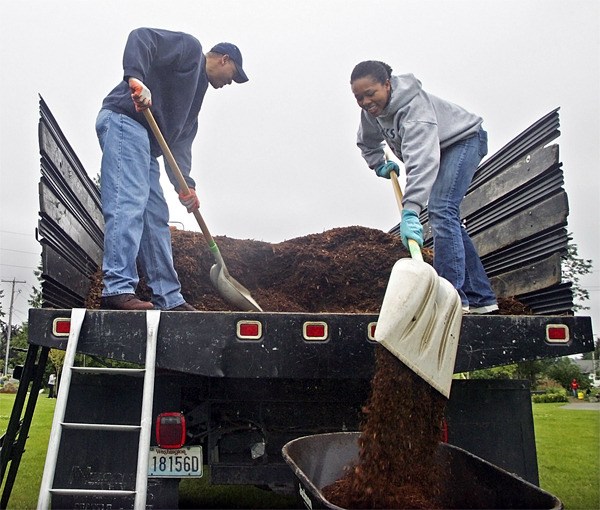 About 35 of her friends came to the event at Heritage Park, where they pulled weeds, picked up litter and shoveled play chips on a Saturday morning.
