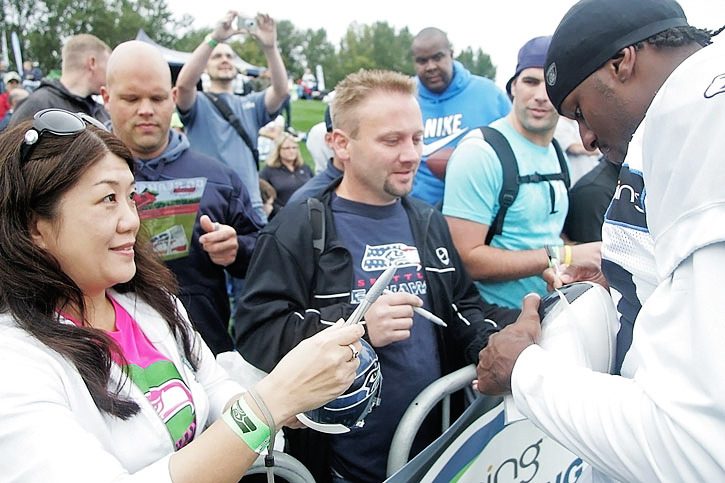 A big part of the Bing Seahawks Training Camp is getting autographs from favorite players. Hundreds of fans attended the first of 15 open practices today at the Virginia Mason Athletic Center. Misa Seely of Bothell and Mark Nielsen of Puyallup get their footballs autographed by Jordan Babineaux.
