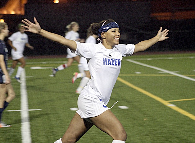 Hazen got on the board early when Dee Dee Green, a transfer from Kennedy, took a pass from Tyra Markey up the left side. Green looked to cross a pass inside, saw how the Kennedy defenders were positioned and shot instead. Her goal put Hazen up 1-0 six minutes into the game.