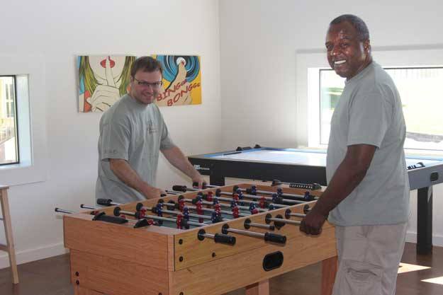 The new center is now a bright colorful space, well-lit, with natural light from lots of windows. IKEA donated the furniture in modern shapes and bold colors. There are books to check out, arts and crafts, snacks and beverages and specially selected video games to play on two large flat screen TVs. There’s both an air hockey table and a foosball table.