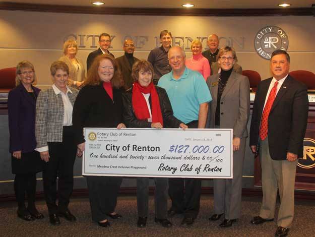 Members of the Renton Rotary Club presented the council with a check for $127,000 this week in support of the new Meadow Crest inclusive playground.