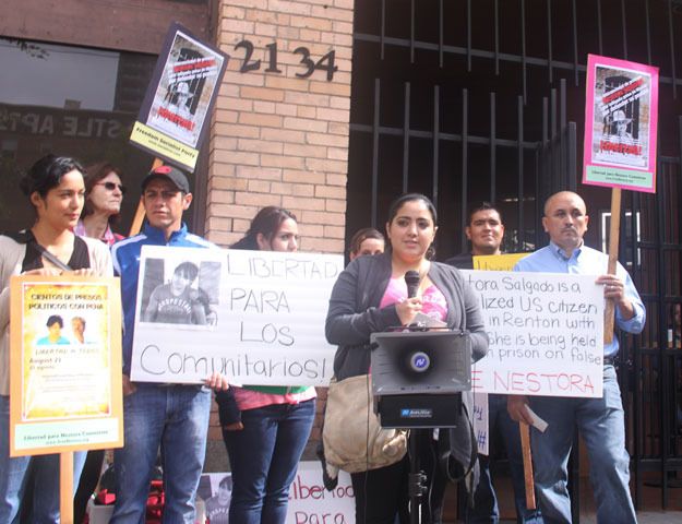 On the first anniversary of her imprisonment in Mexico, family and supporters of Nestora Salgado held a rally in front of the Mexican Consulate in Seattle, calling for her release.