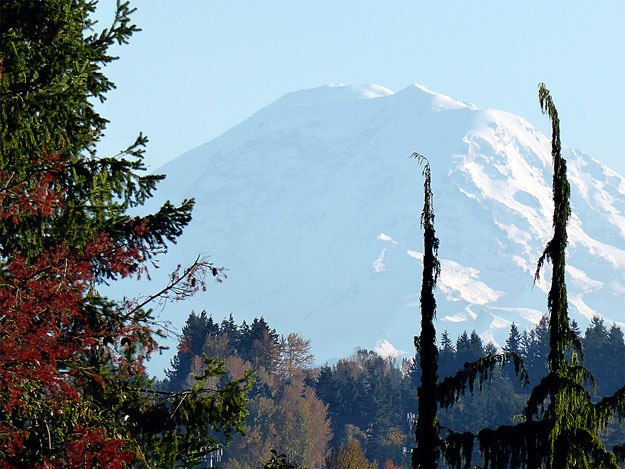 This week’s weather photo comes to us from Suzy Orehek grabbed this picture of Mt. Rainier peaking out from behind a splash of fall color from a road just north of Gene Coloun Park.