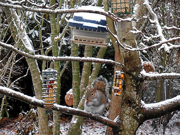 This week’s weather photo comes to us from Val Bradley, who calls this shot of a squirrel in her backyard “lunch at the deli.”
