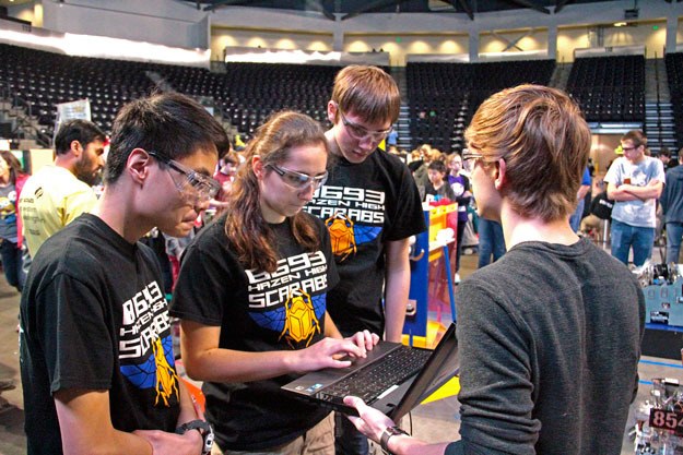 Members of Hazen's FTC robotics team fine tune their machine at the state FIRST Tech Challenge Robotics competition