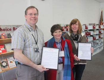 Kim Burkhardt, executive director of the Renton-based organization, presented the “David Award” to John Sheller, King County Library System library cluster manager, and Michele Niblock, Renton Library manager.