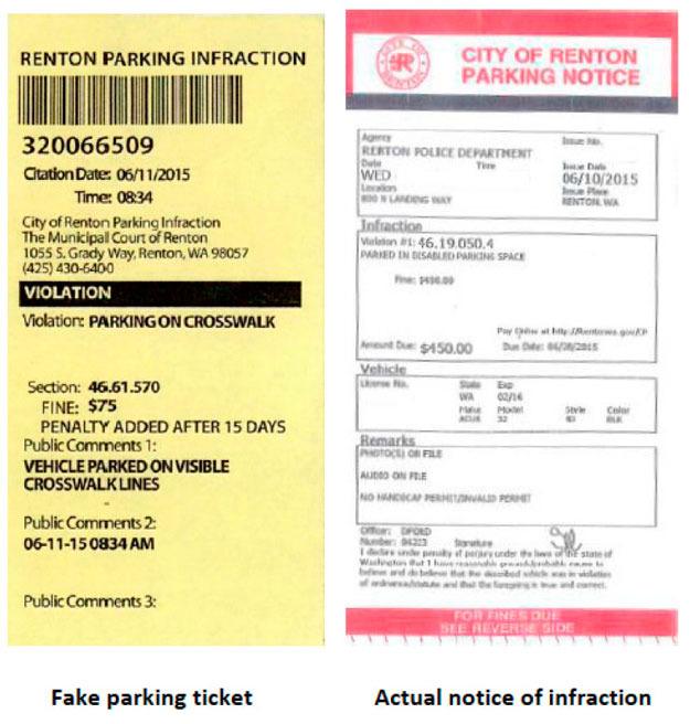 A Renton man returned to his parked car on June 11 and discovered what appeared to be a parking infraction notice. On contacting the Renton Municipal Court, he learned that the parking ticket was actually a fake.