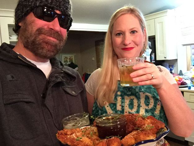 His new web series, currently in production and called “Boozy Kitchen” will feature recipes like the Honey Bourbon Chicken Tenders we were making in my kitchen.