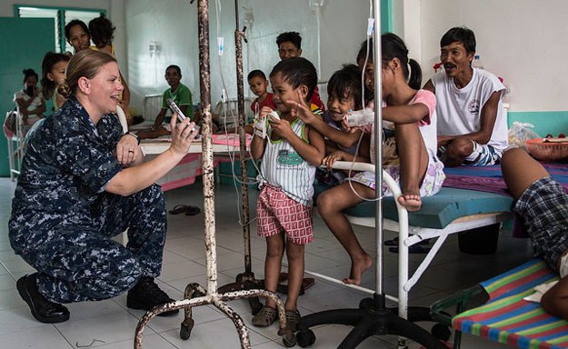 Hospital Corpsman Second Class Jessica McCullough, a native of Renton, shows a photo to children at Ziga Memorial hospital during a subject matter expert exchange in support of Pacific Partnership 2016.