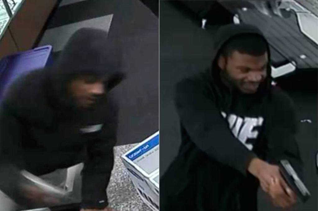 The suspect pointing the gun was described as a black male wearing a black hoodie with thick white letters on the front, carrying a silver handgun. The victim did not get a good look at the second suspect.