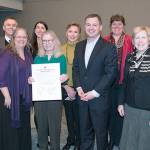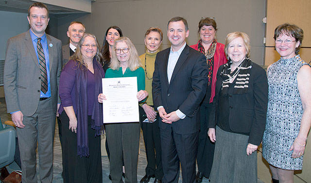 Front Row: (left to right) Councilmember Joe McDermott, Judy Johnson with the Cowlitz Indian Tribal Health Services Pathways in Healing Program, Lucy Berliner, director of the Harborview Center for Sexual Assault and Traumatic Stress, Councilmembers Rod Dembowski, Jeanne Kohl-Welles and Kathy Lambert.