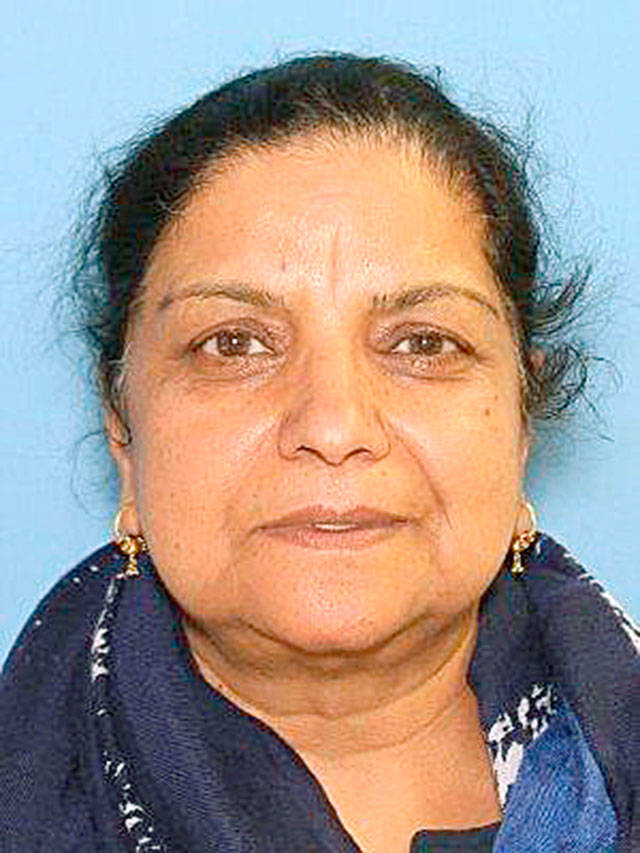 According to a media release, the woman, Inderjit K. Singh, 56, was reported missing by her husband, Gian Singh. Gian Singh told police he had not seen his wife since 5:40 a.m. that day. According to a Federal Way Police crime blotter report, Inderjit Singh had left her vehicle, keys, purse and phone at their residence. Inderjit Singh took only her identification. Gian Singh told police his wife has had a history of fainting and falls in the last year. The media release also stated Inderjit Singh had suffered from depression. Officers searched the Singhs’ residence, along with another property nearby, according to the police report. Family members told police her disappearance is suspicious as she is known to be in constant communication with her family.