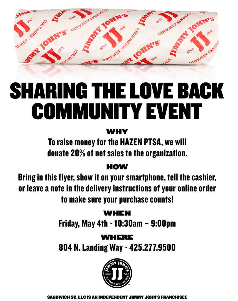 Hazen High School’s PTSA and FBLA (Future Business Leaders of America) are hosting a joint fundraiser 10:30 a.m. to 9 p.m., May 4, at Jimmy John’s at The Landing, 804 N. Landing Way.
