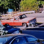 The pickup truck is described as a red, early to mid 1980s GMC or Chevrolet pickup, with a white stripe. It also features a homemade wooden structure on the truck bed.
