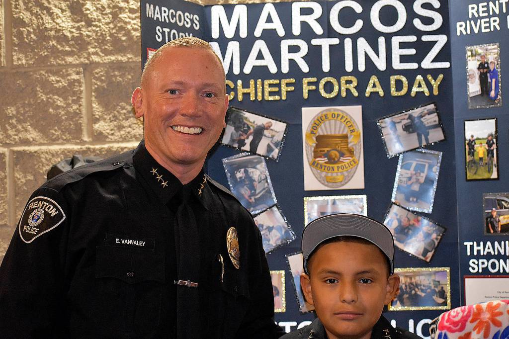 For the first time in more than 10 years, the Renton Police Department participated in Chief for a Day, swearing in 8-year-old Marcos Martinez as “little chief” Thursday, Aug. 16 at the event that hosted 33 Washington state law enforcement agencies, and their little chiefs.