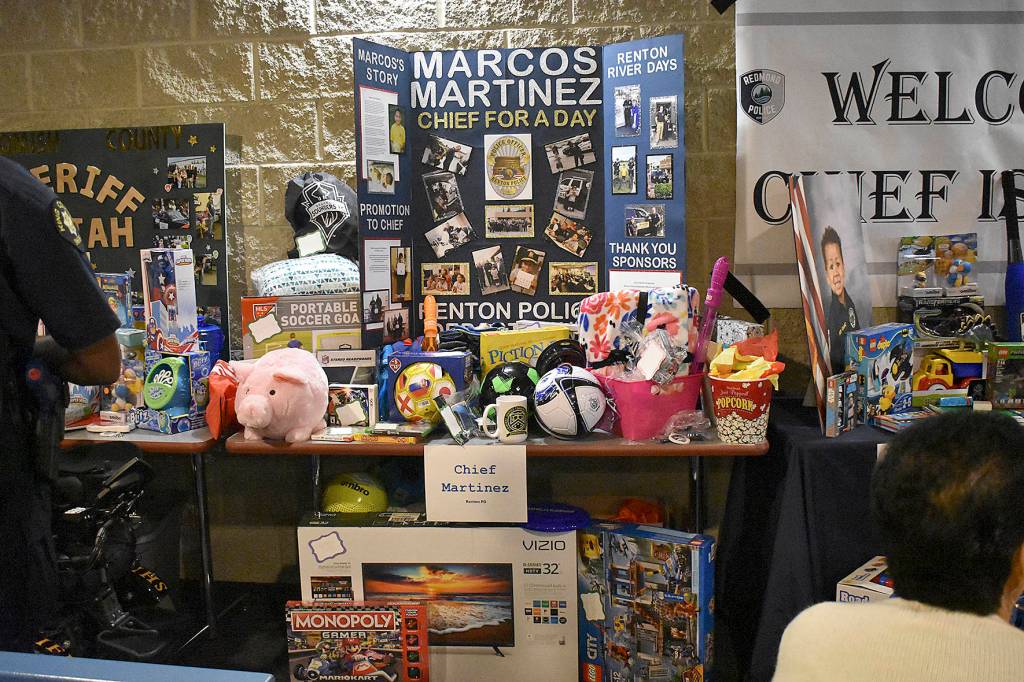 Acting Renton Chief Ed VanValey said you could see the surprise on Marcos’ face when he saw the gifts. Everything was donation only. Many businesses offered gift certificates to the family for schools supplies, clothes and food. The Sounders donated a swag bag of Sounder’s gear for Marcos, who is a big soccer fan.