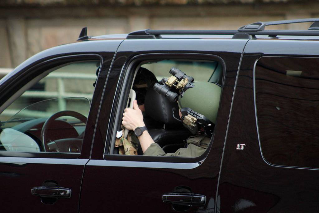 Obama’s motorcade, which included armed police guards, waits in the alley behind the Tacoma Public Library on Sunday, March 24. Olivia Sullivan/staff photo