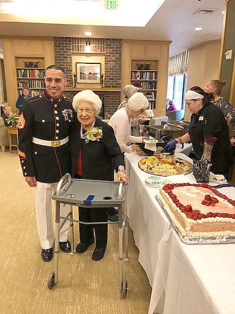 Friends and fellow residents in her senior living community gathered to celebrate her life achievements with the presenting of a certificate of recognition from the Marine Corps. Recruiting Station in Seattle. The event was organized as a surprise for George, planned by Renton High School’s librarian assistant Mary Galbraith.