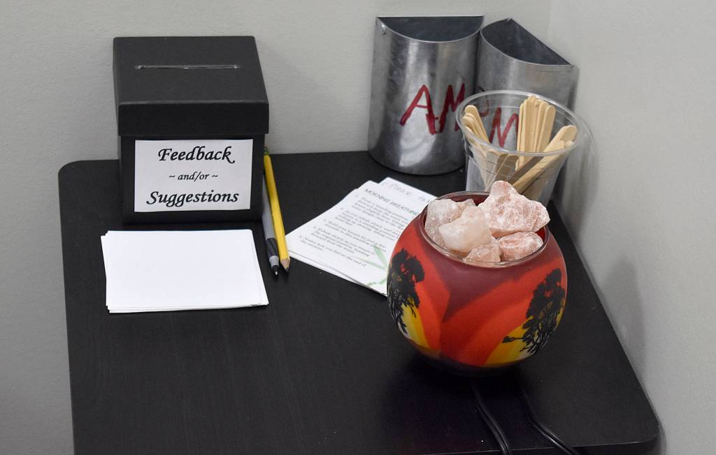 Use of the Serenity Room is tracked by a simple popsicle stick system. Staff move a stick from one can to another for each trip they take to the room in a day. In May, for example, staff say the room was used 55 times.