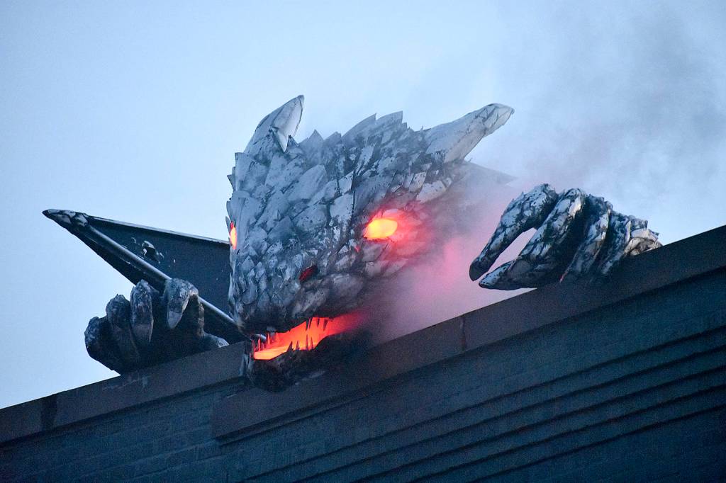 To match the changing times and to find a creative look for a crack in the roof of a downtown building, Renton Municipal Arts Commission and Western Neon collaborated on a 750-pound dragon. The sculpture was celebrated with folks flooding downtown Renton to see the lighting of the eyes and mouth on the beast. The dragon was then named Erasmus, in honor of city founder Erasmus Smithers.
