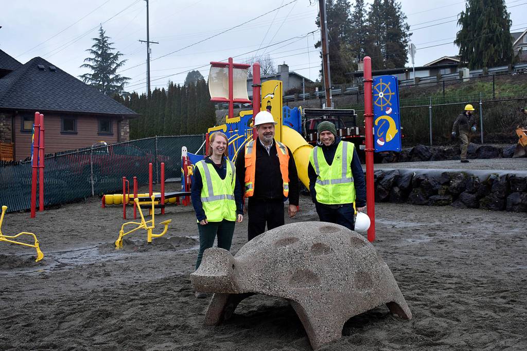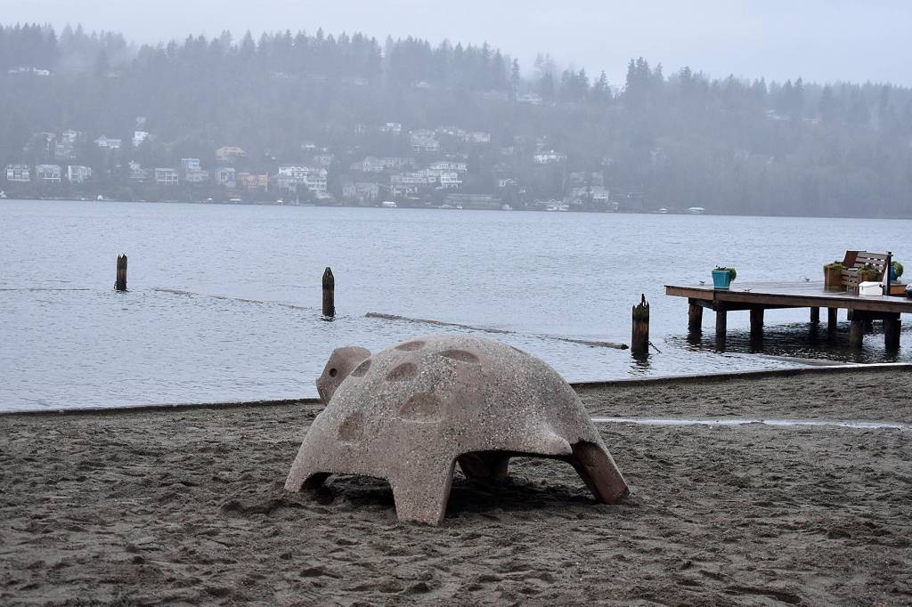 On a rainy Friday morning, city staff moved the hefty, 1,400-lb concrete turtle installation, Tommy the Turtle, from city storage to Kennydale Beach Park. Community leaders and staff were present at the event, including Renton Capital Projects Coordinator Betsy Severtsen. This was her first public project with the city.