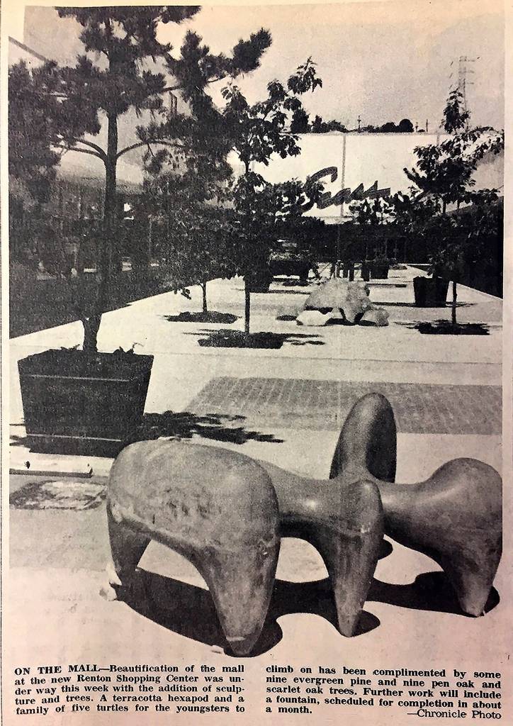 Newspaper clippings from the Renton Chronicle show likely the same Tommy we have today in a photo from 1960 of the Renton Shopping Center, next to a Sears. An article in the June 2006 Renton Historical Quarterly explains that when Sears left in 1980, the downtown shopping center (now Fred Meyers Plaza) donated Tommy and a dolphin statue to city of Renton. The dolphin, Flipper, was moved to Henry Moses Aquatic Center and Tommy was moved to Highlands Library.