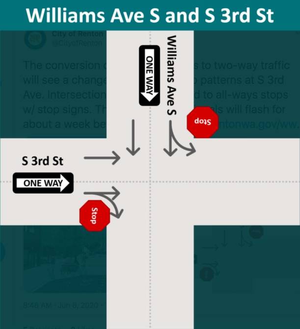 City of Renton posted that starting Monday, June 8, stop patterns at South Third Avenue intersections of Wells Avenue South and Williams Avenue South will be converted to all-way stops with stop signs. These streets are still one way for now.