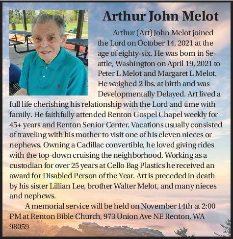Art lived a full life cherishing his relationship with the Lord and time with family. He faithfully attended Renton Gospel Chapel weekly for 45+ years and Renton Senior Center. Vacations usually consisted of traveling with his mother to visit one of his eleven nieces or nephews. Owning a Cadillac convertible, he loved giving rides with the top-down cruising the neighborhood. Working as a custodian for over 25 years at Cello Bag Plastics he received an award for Disabled Person of the Year. Art is preceded in death by his sister Lillian Lee, brother Walter Melot, and many nieces and nephews.