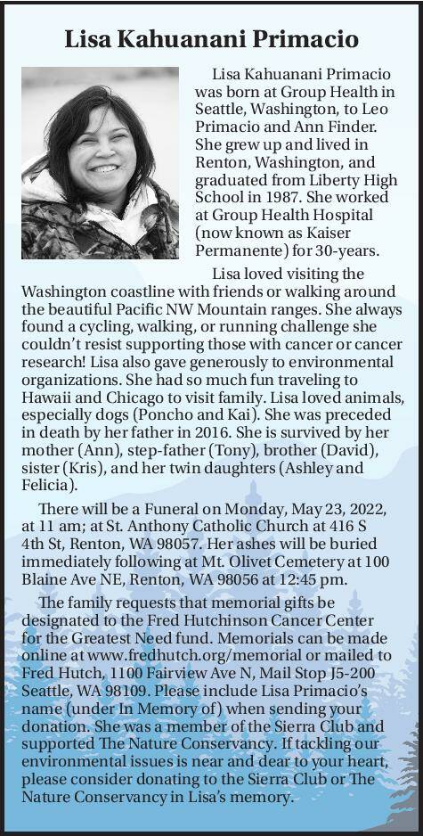 The family requests that memorial gifts be designated to the Fred Hutchinson Cancer Center for the Greatest Need fund. Memorials can be made online at www.fredhutch.org/memorial or mailed to Fred Hutch, 1100 Fairview Ave N, Mail Stop J5-200 Seattle, WA 98109. Please include Lisa Primacio’s name (under In Memory of ) when sending your donation. She was a member of the Sierra Club and supported The Nature Conservancy. If tackling our environmental issues is near and dear to your heart, please consider donating to the Sierra Club or The Nature Conservancy in Lisa’s memory.