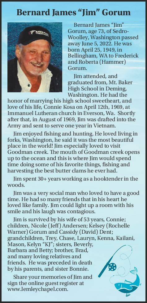 Bernard James “Jim” Gorum, age 73, of Sedro- Woolley, Washington passed away June 5, 2022. He was born April 25, 1949, in Bellingham, WA to Frederick and Roberta (Hammer) Gorum.
