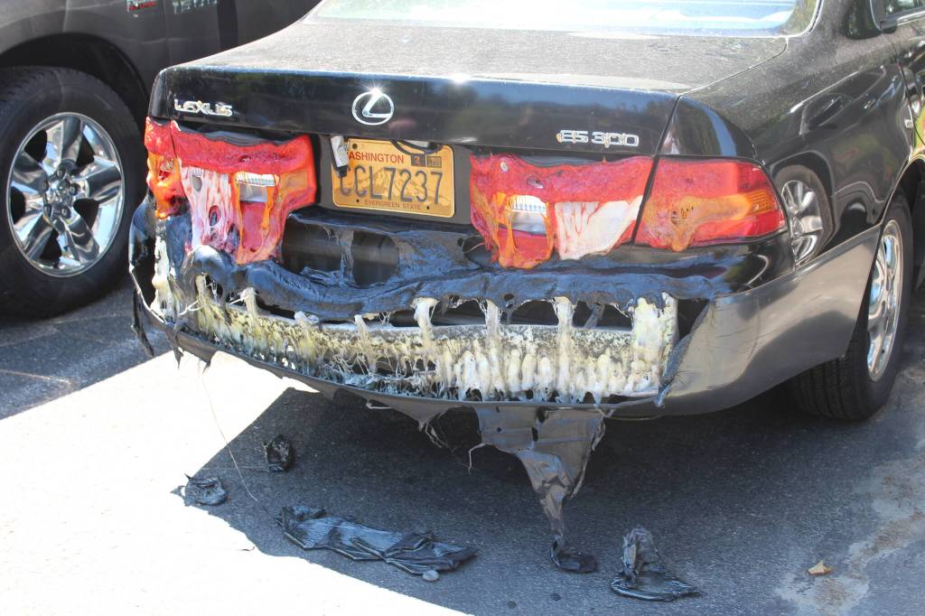 The back end of a car parked across from where the fire raged partially melted from the heat of the flames. Photo by Bailey Jo Josie/Sound Publishing.