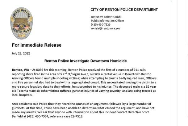Renton police report that a 32-year-old male from Tacoma was killed in a shooting just after midnight July 23 in downtown Renton.