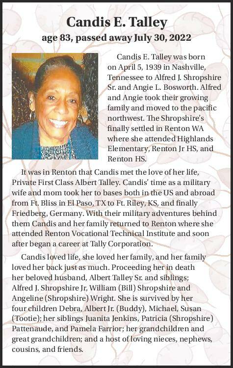 Candis E. Talley was born on April 5, 1939 in Nashville, Tennessee to Alfred J. Shropshire Sr. and Angie L. Bosworth. Alfred and Angie took their growing family and moved to the pacific northwest. The Shropshire’s finally settled in Renton WA where she attended Highlands Elementary, Renton Jr HS, and Renton HS.