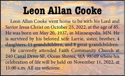 Leon Allan Cooke went home to be with his Lord and Savior Jesus Christ on October 25, 2022, at the age of 85. He was born on May 20, 1937, in Minneapolis, MN. He is survived by his beloved wife Larrie, sister, brother, 4 daughters, 11 grandchildren, and 8 great-grandchildren.