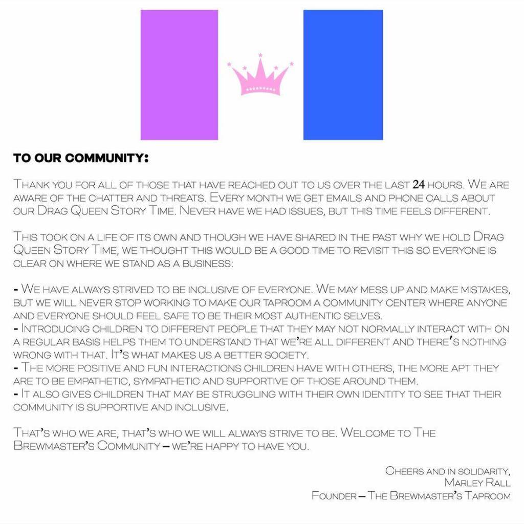 The vandalism happened a day after a post from a conservative Facebook page — which has since been taken down — began making traction online after calling for a protest of a drag queen storytime event that takes place at The Brewmaster’s Taproom every second Saturday of the month.