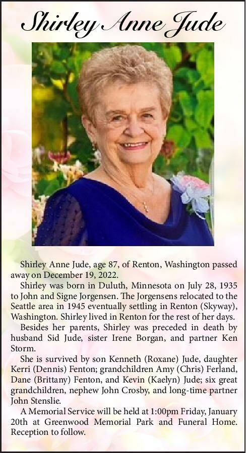 Shirley Anne Jude, age 87, of Renton, Washington passed away on December 19, 2022.