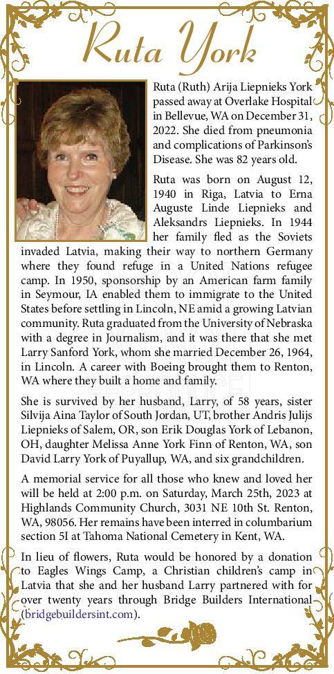 Ruta (Ruth) Arija Liepnieks York passed away at Overlake Hospital in Bellevue, WA on December 31, 2022. She died from pneumonia and complications of Parkinson’s Disease. She was 82 years old.