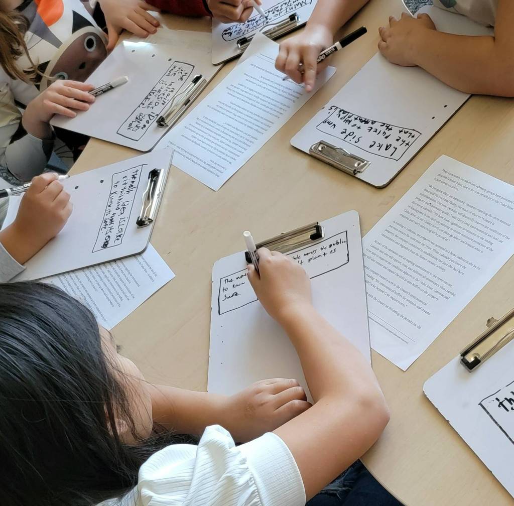 Some of the questions students had were: How does the asphalt damage the environment? Why does the plant need to be next to the Cedar River? Who is telling the truth? And if the salmon eat the asphalt, do they die?