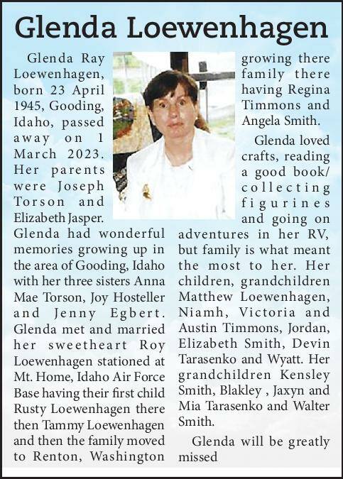 Glenda Ray Loewenhagen, born 23 April 1945, Gooding, Idaho, passed away on 1 March 2023.