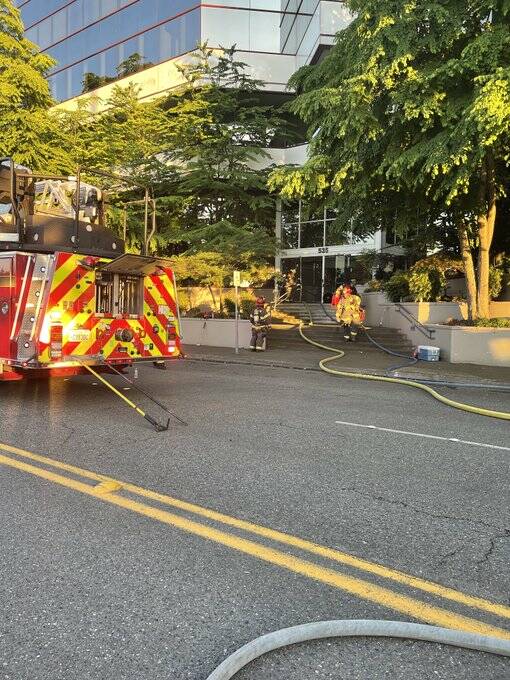 Local firefighters put out a fire in an abandoned Renton building on Sunday evening, June 11, later finding two unhoused people and a dog on the roof of the building.