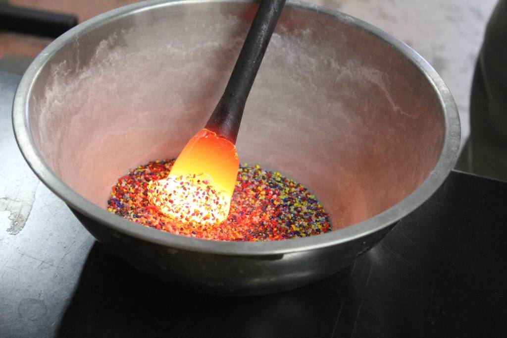 First is the electric furnace, which holds 150 pounds of glass at 2,100 degrees Fahrenheit. Second is what’s called the “glory hole” which is hotter than the furnace at 2,200 degrees Fahrenheit.